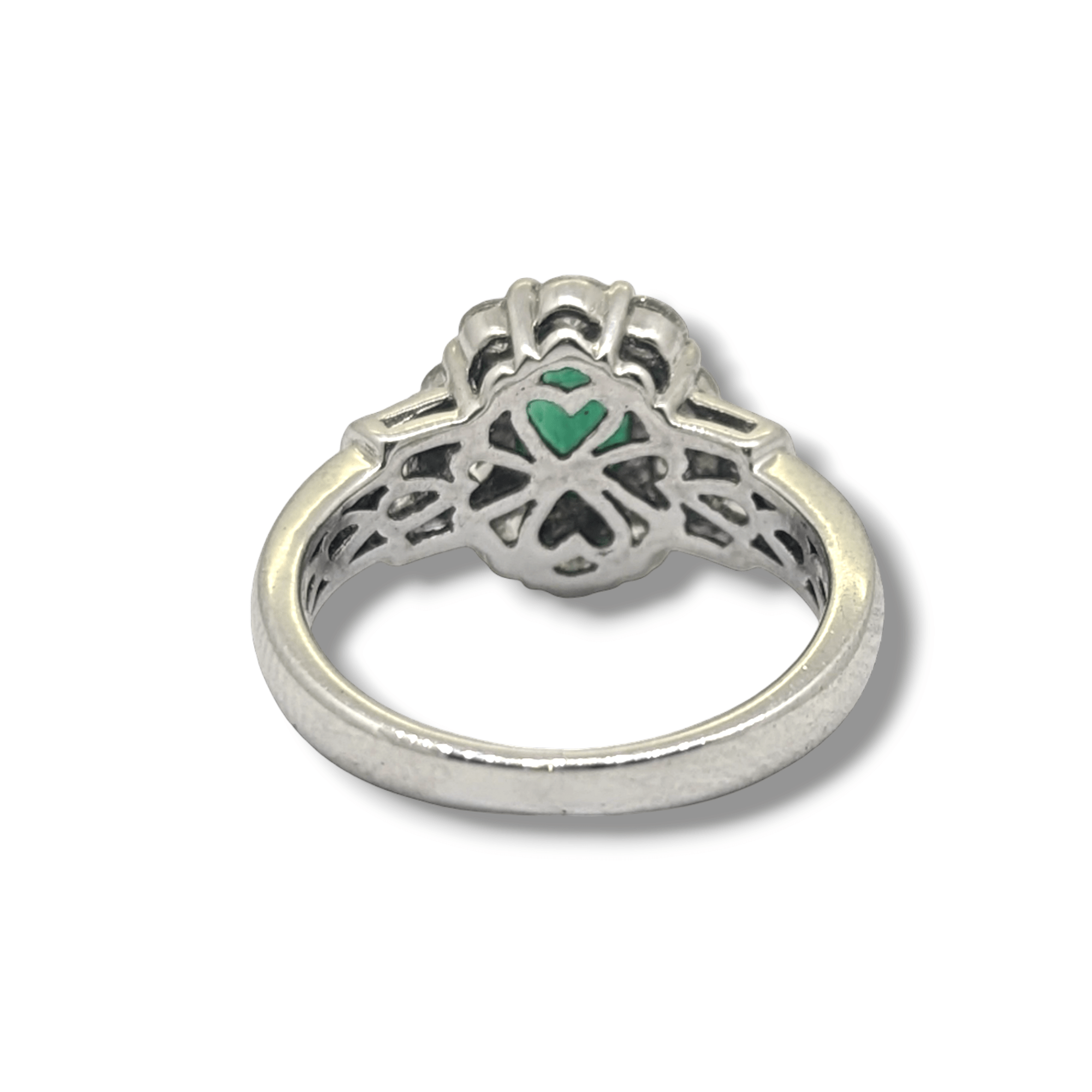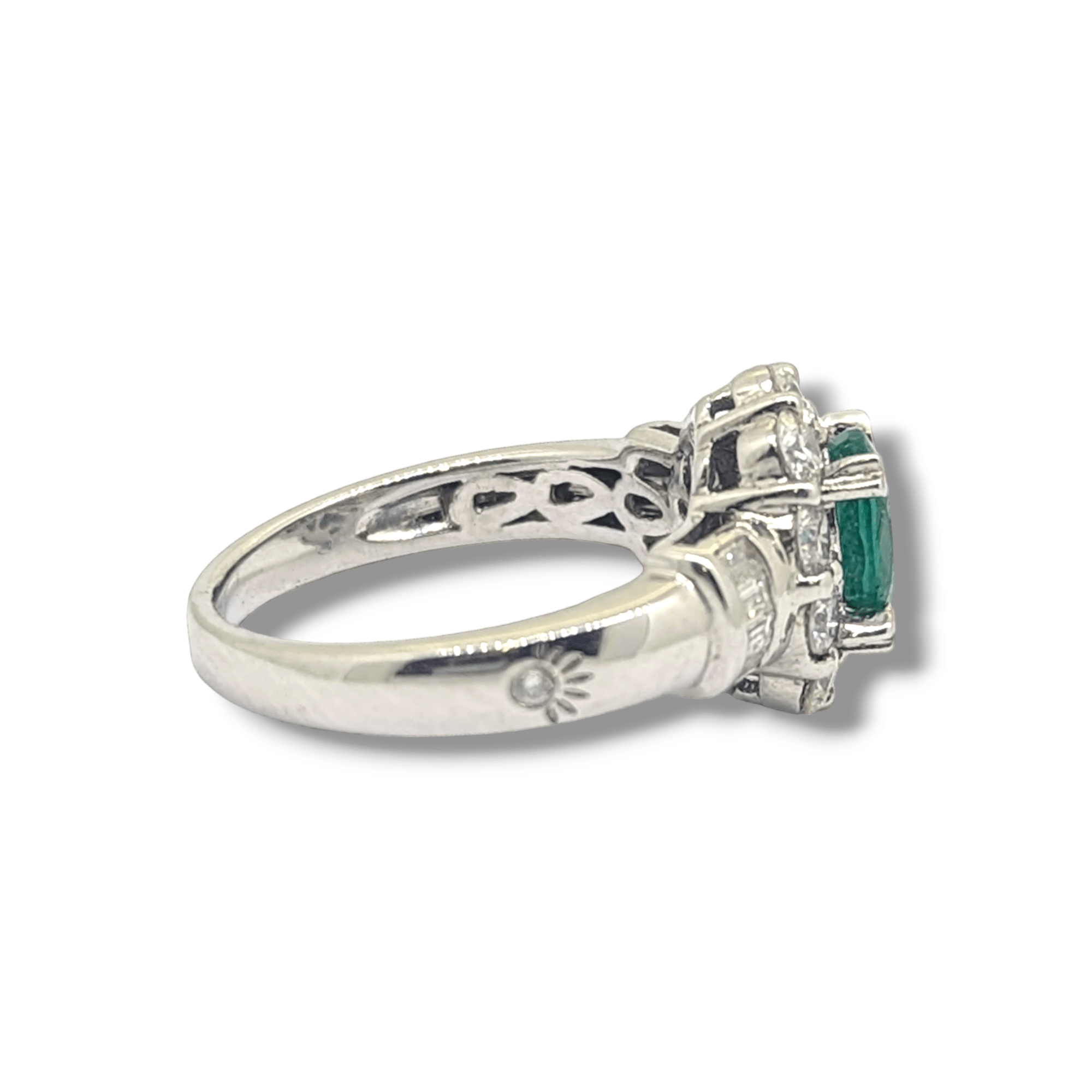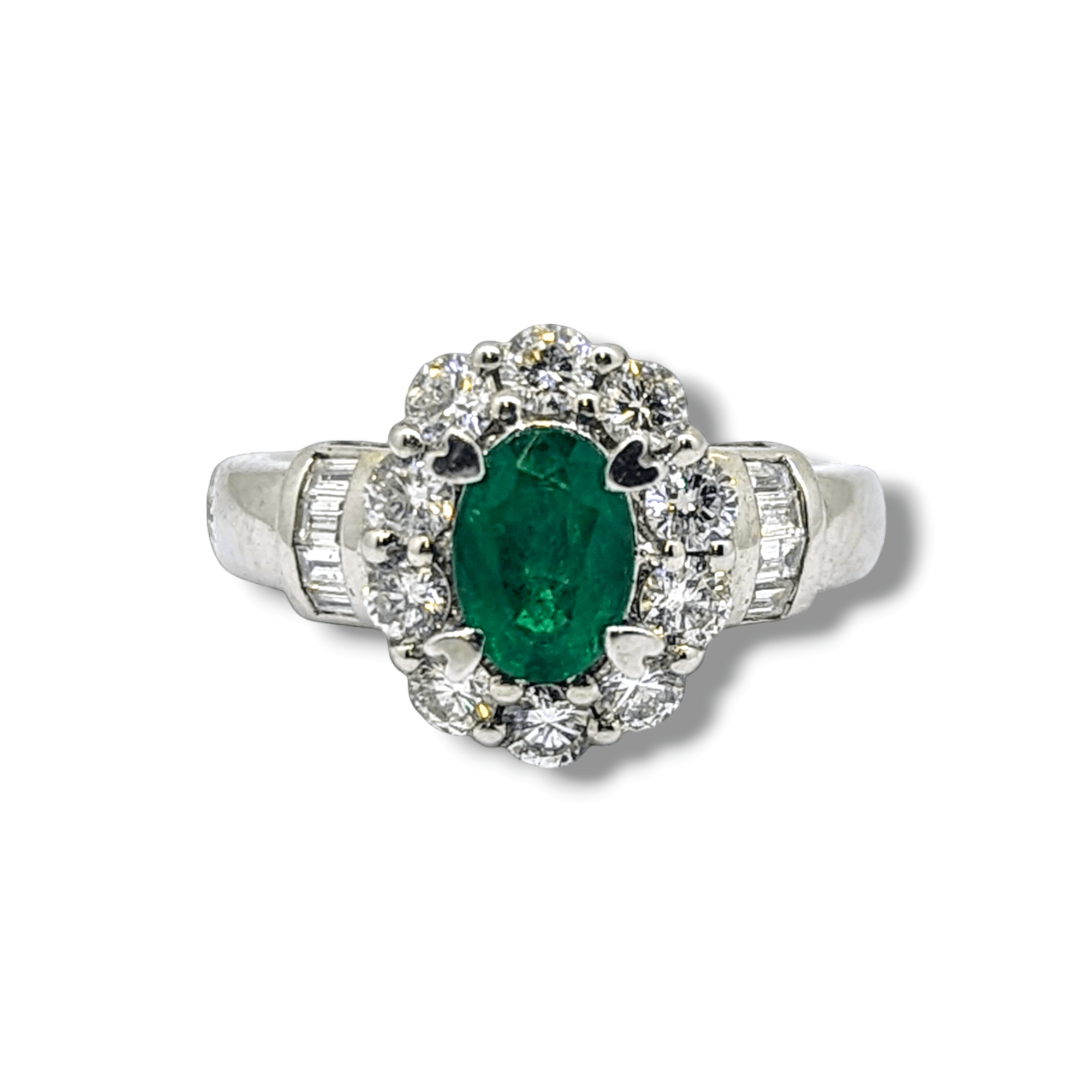 This lovely 14 carat emerald & diamond cluster ring really has it all. A beautiful oval facetted emerald is surrounded by ten round brilliant cut diamonds. In the shoulders we have four baguette cut diamonds with a small round brilliant cut diamond with sun burst motif in the shank. Looking closer you will find hearts for the four claws securing the emerald and also in the pierce work gallery underneath. A fantastic engagement ring.