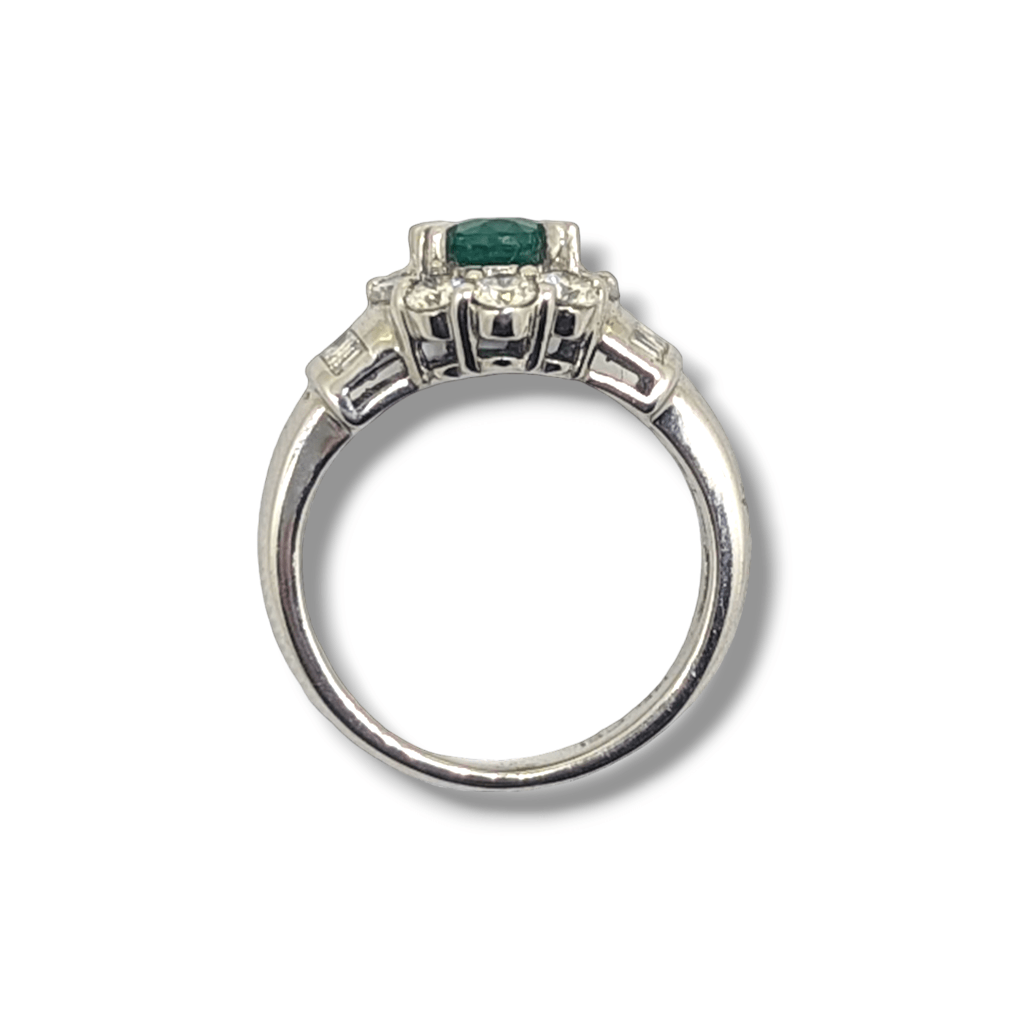 MEASUREMENTS : Emerald approximately 1.18ct. Round brilliant diamonds approximately 0.10ct each. Four baguettes in each shoulder approximately 0.12ct total.