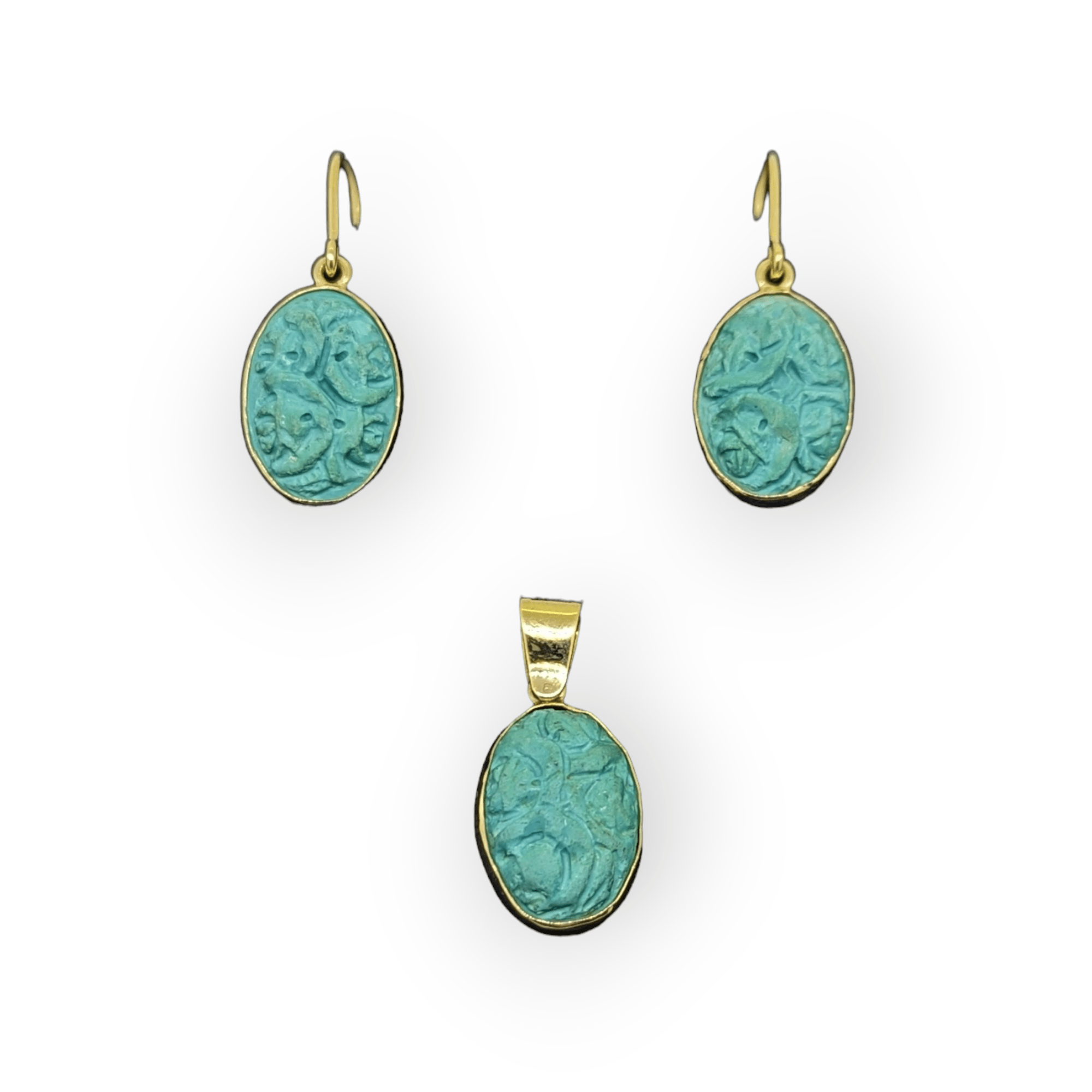 15 Carat Gold Carved Soap Stone Earrings & Pendant Set