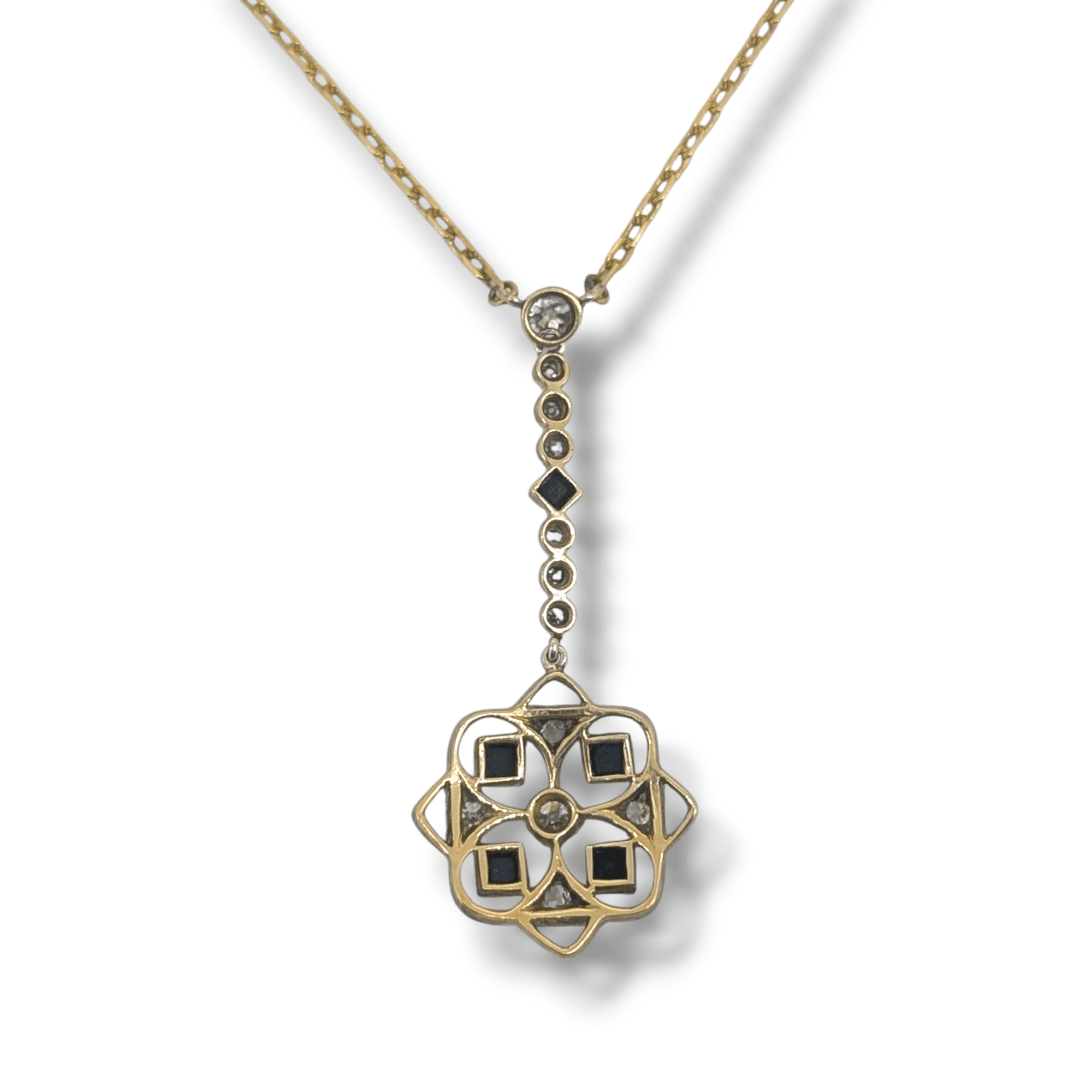 This Edwardian pendant has a classic design for the period. All stones are milgrain set, with a gorgeous openwork drop using the negative space to give a daisy like impression. Suspended from an 18 carat yellow gold cable link chain, 18 inches.
