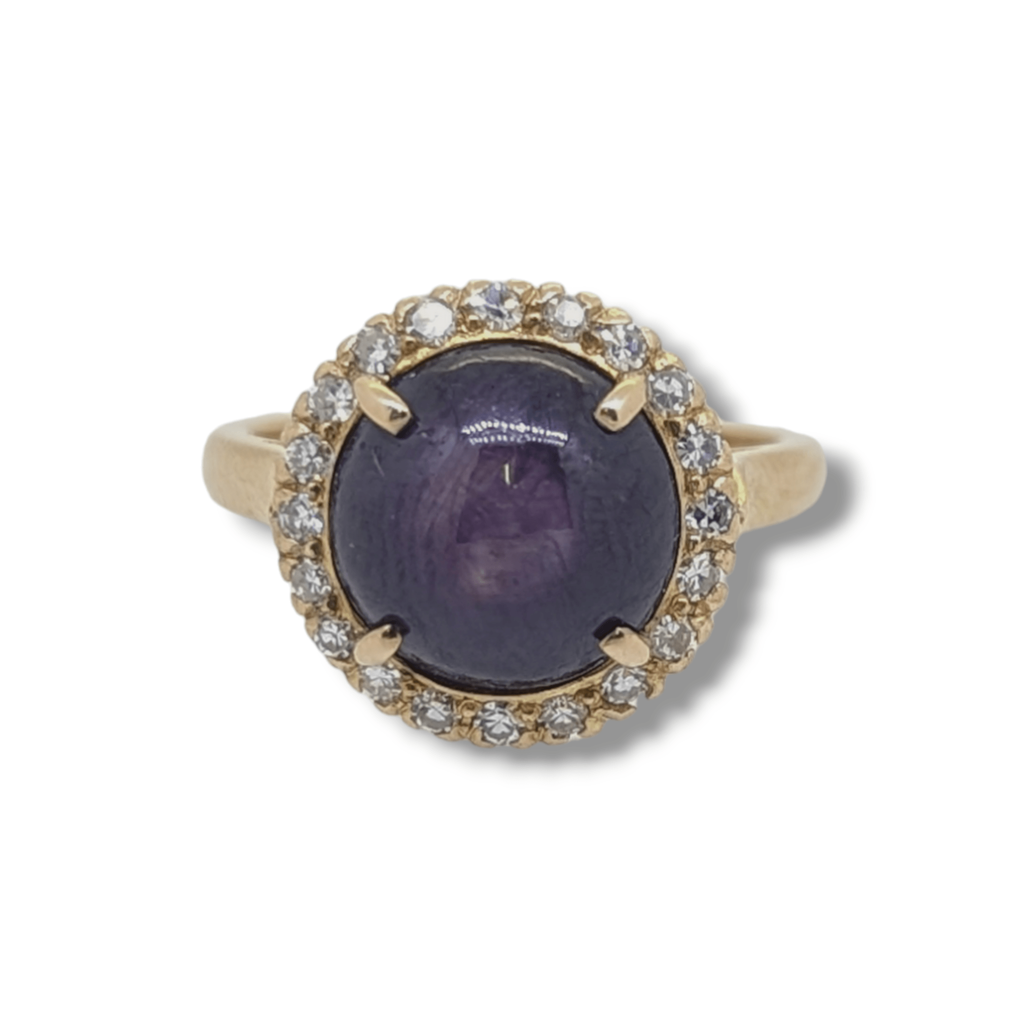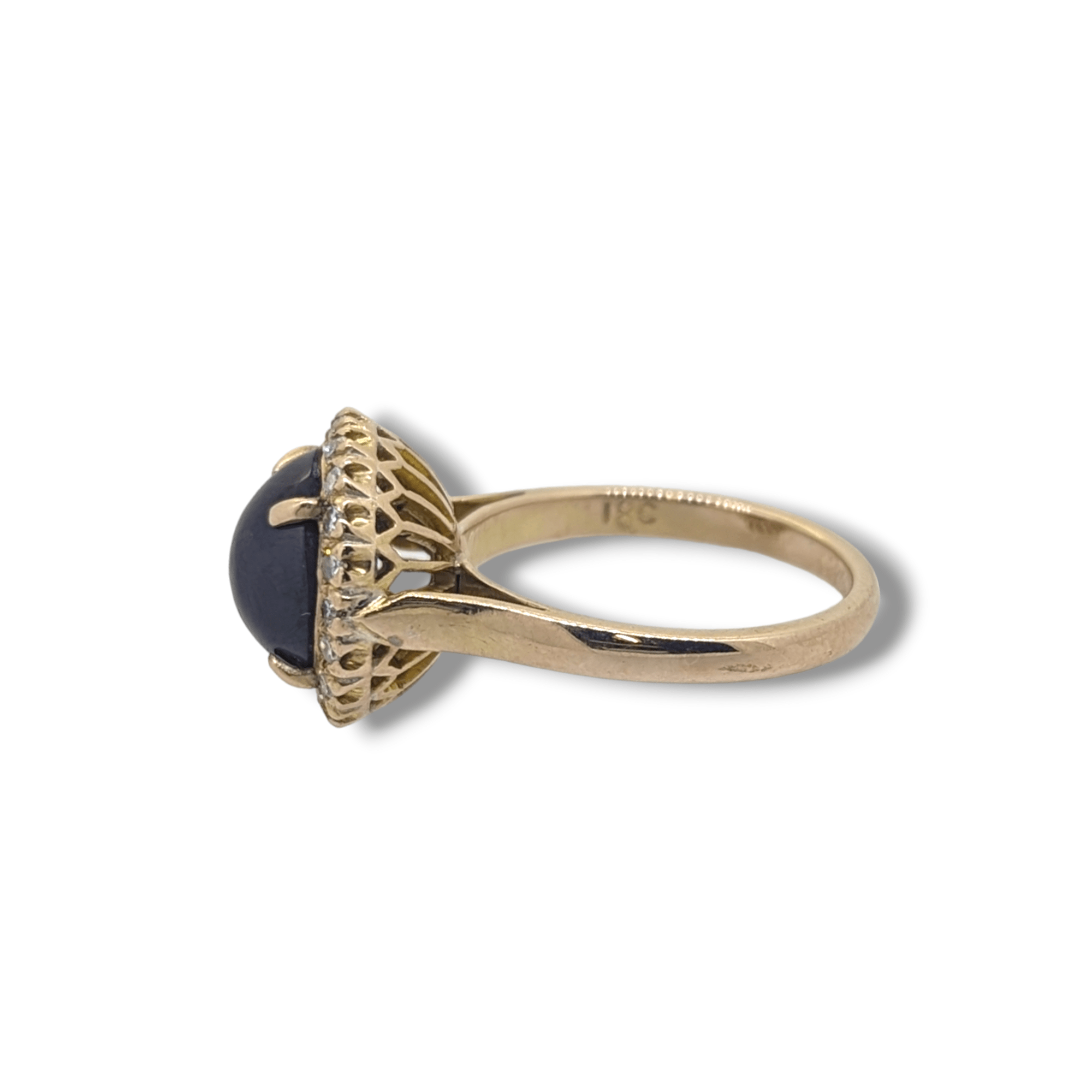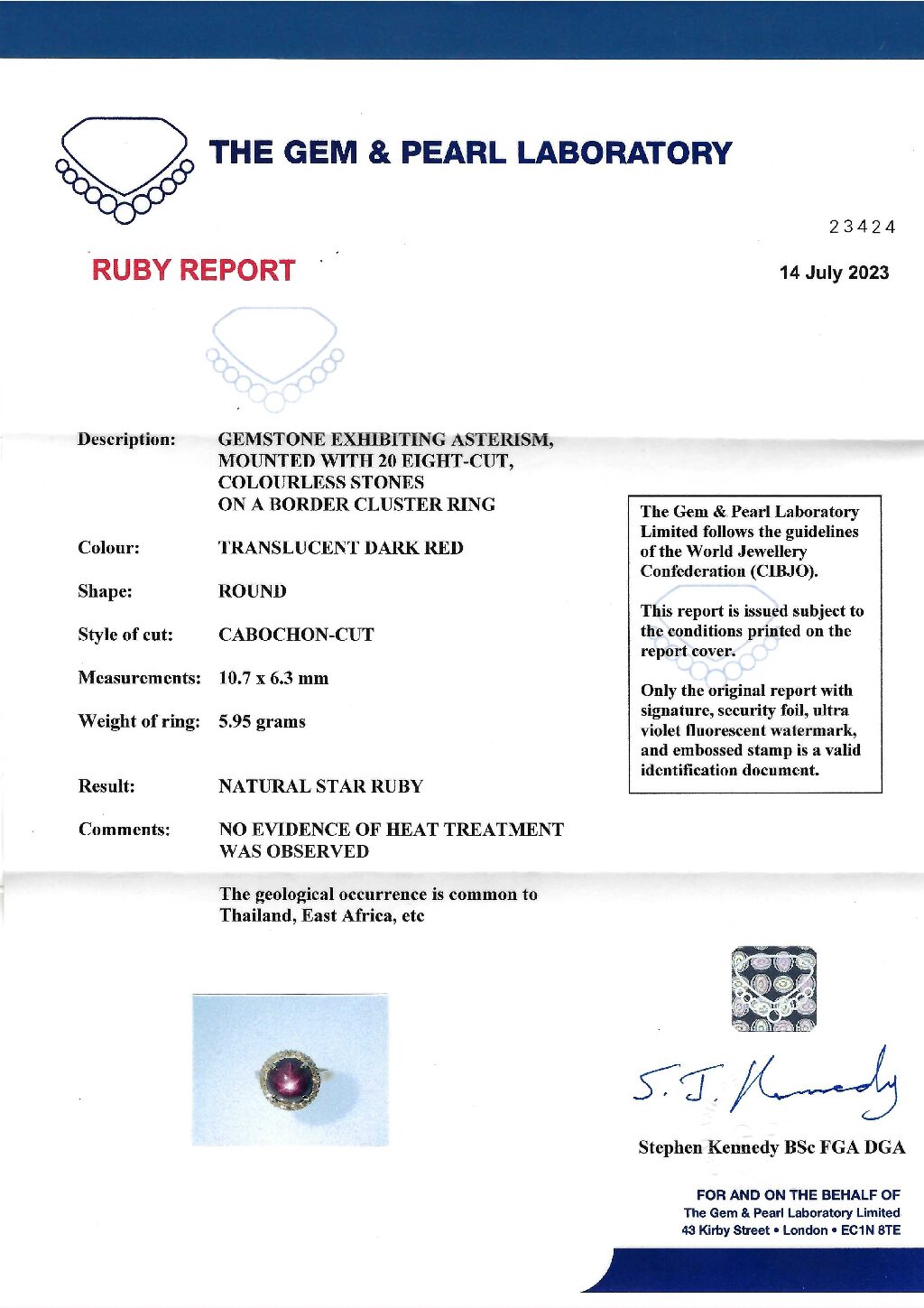 This gorgeous 18 carat yellow gold natural star ruby ring is complimented with twenty, eight cut diamonds in the surround. Accompanied by a Lab certificate.