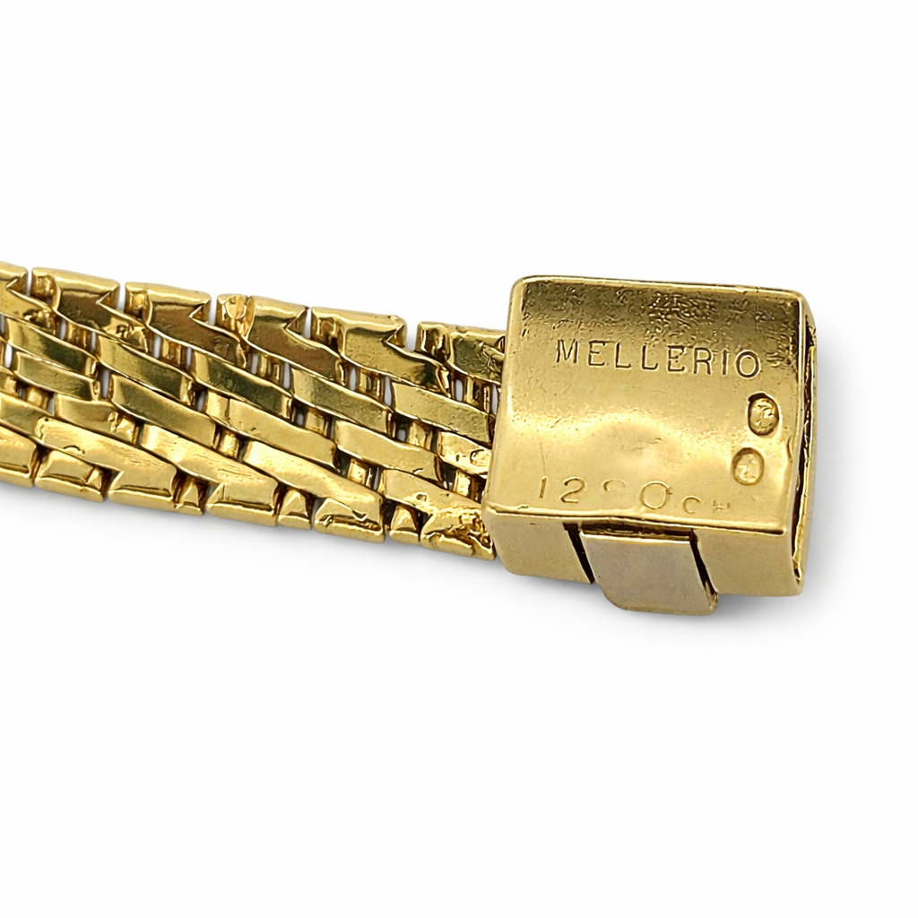 A beautifully crafted 18ct yellow gold woven collar necklace by the renowned Parisian house Mellerio. Designed in an elegant graduated form, the articulated gold construction creates a fluid, sculptural silhouette that sits gracefully against the neckline. Engraved with the Mellerio name, this piece reflects the confident glamour and exceptional craftsmanship of 1970s French jewellery. A timeless statement necklace of enduring sophistication.