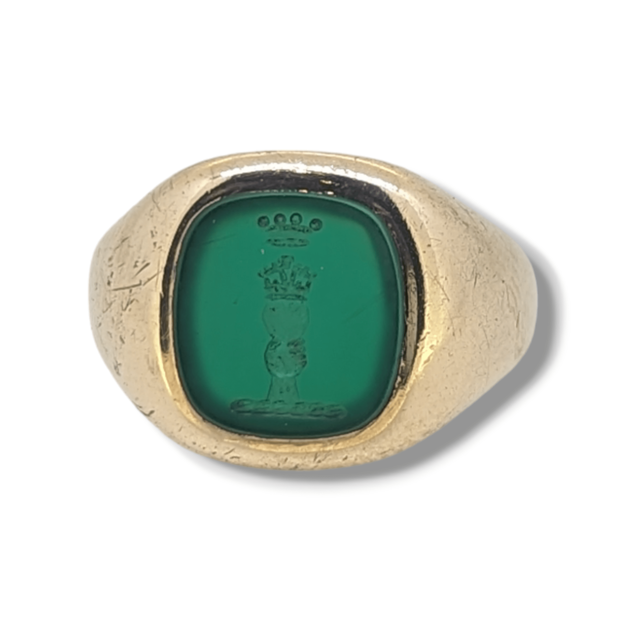 A classic 9ct yellow gold green agate signet. Previously engraved with a family crest. Hallmarked Birmingham 1984.