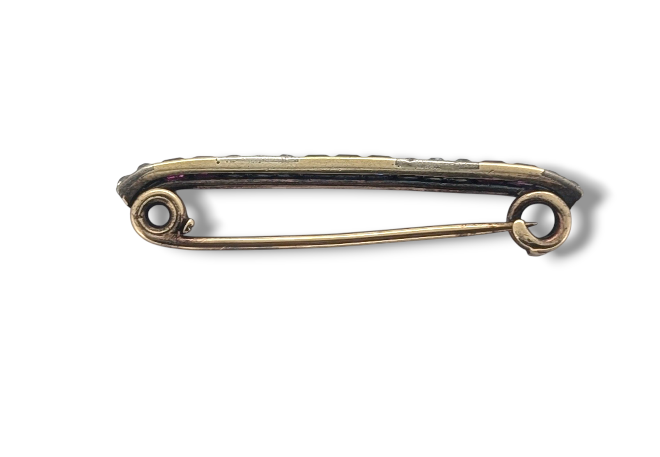 Vintage 18ct Gold Sapphire, Ruby & Old Cut Diamond Bar Brooch